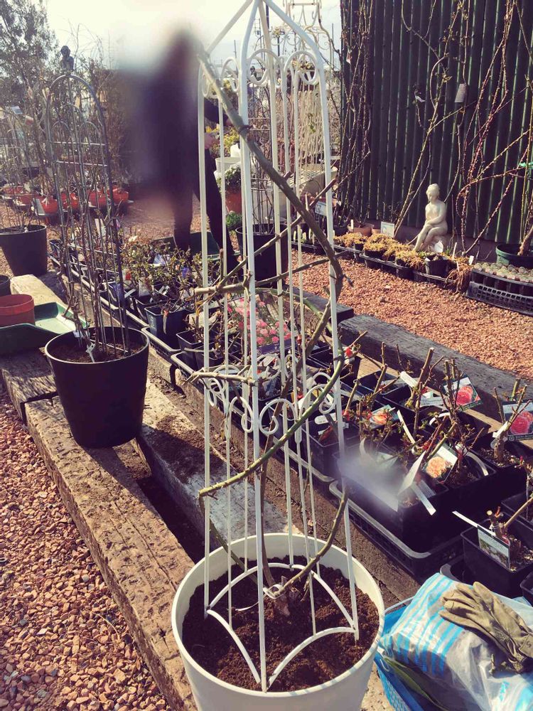 この間は、もっと大きなオベリスクにもっと長い枝を三人で誘引したんですが、一人となると難しいですねぇ😵