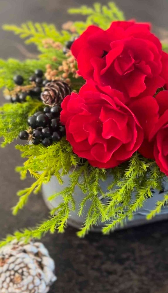 ゴールドクレストにセンリョウや南天とかの紅い実を合わせる代わりに、色鮮やかで小ぶりな赤バラのチョイスは華やかです〜ね👍(ت)♪