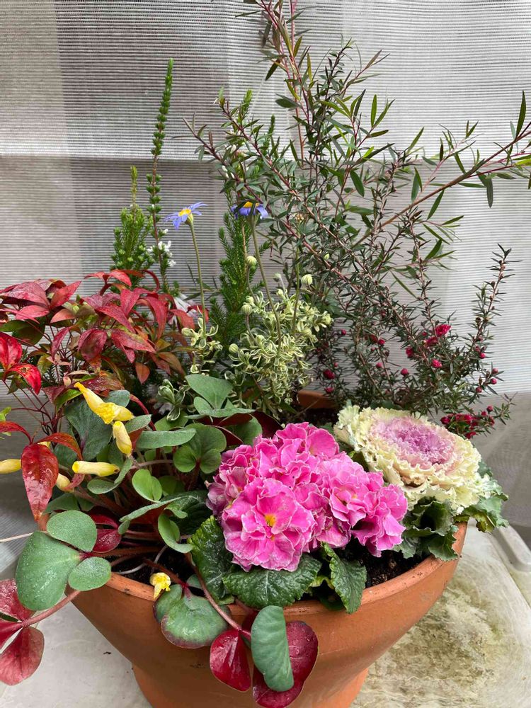 園芸店で開催された寄せ植え教室で普段売られている苗が30種類ほどある場所で好きな苗を8種類選んでの寄せ植え💗