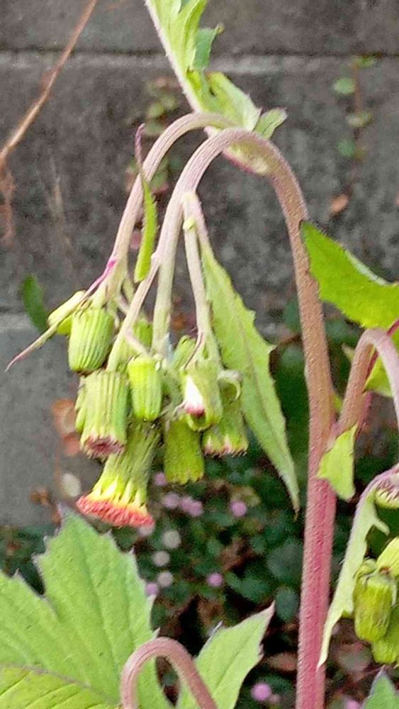 主の枯れた鉢にいつの間にか大きくなり花が付きました 萎れたのではなく茎ごとうつむいて咲くベニバナボロギクです。変わった咲き方ですね🤔