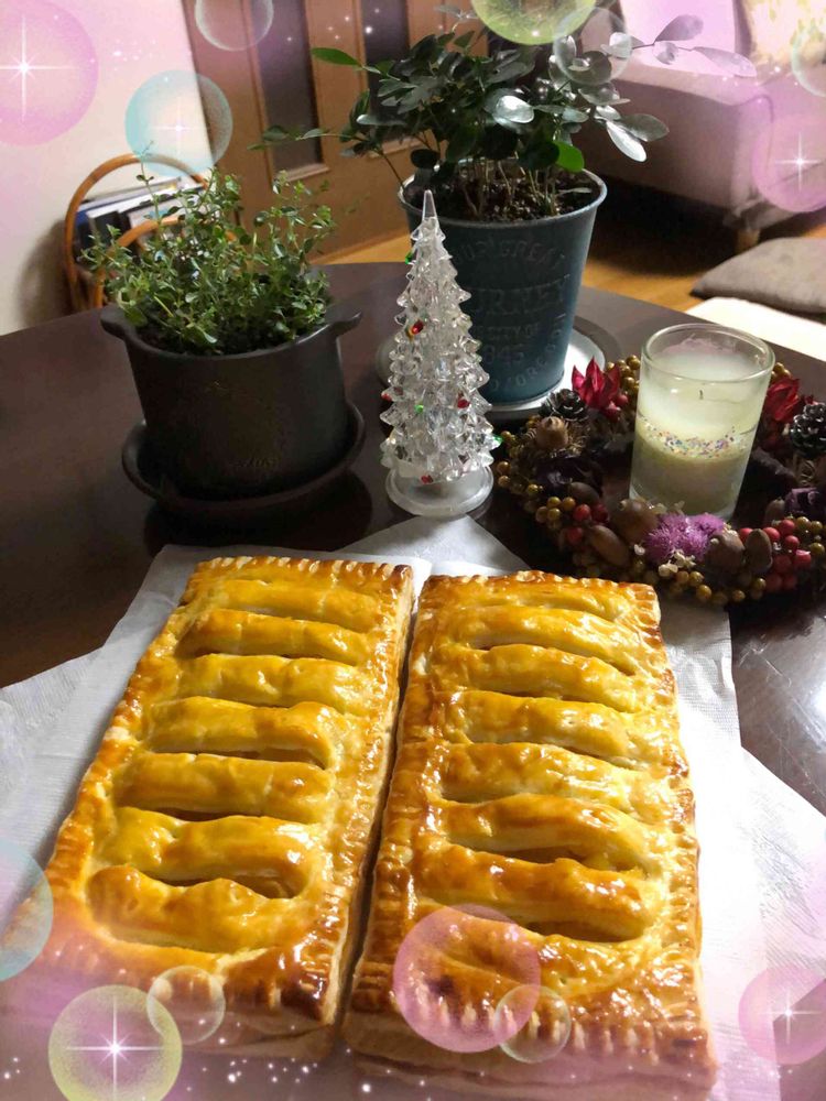 アップルパイは長方形だと簡単です、、パイシートにレシピ書いてあるし、、りんご🍎を切って煮て、、パイシートに載せて、焼いたら出来上がり、、やってみて〜出来ますよ👍😊