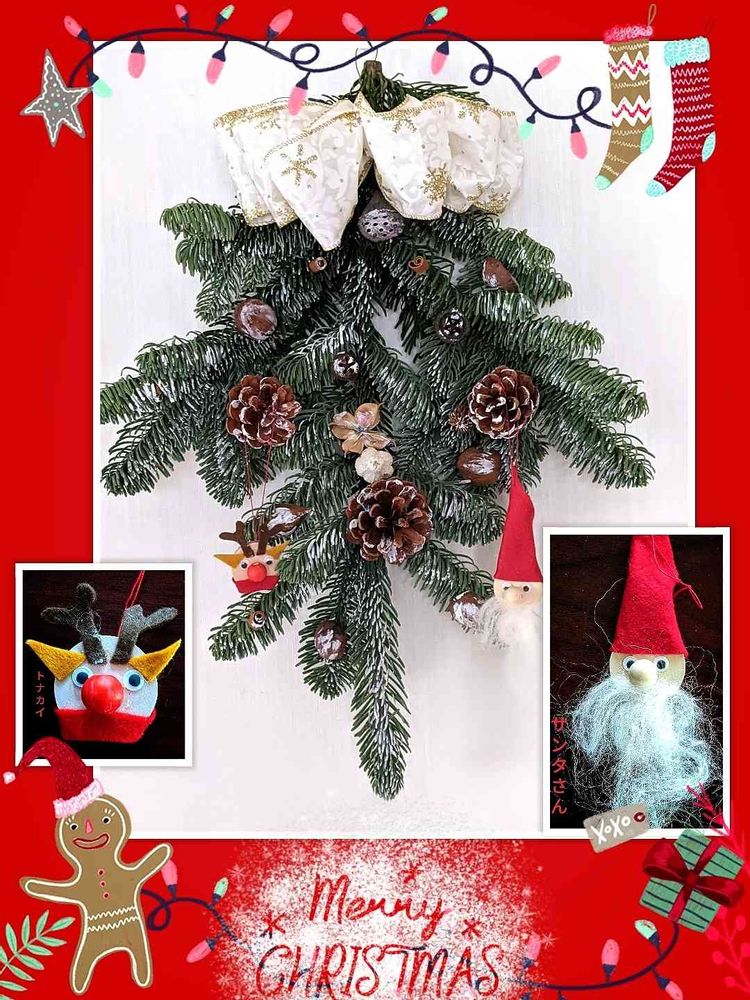 生のモミの枝に木の実を付け、サンタ、トナカイのオーナメントを作ったそうです🎅🐐✨🌿