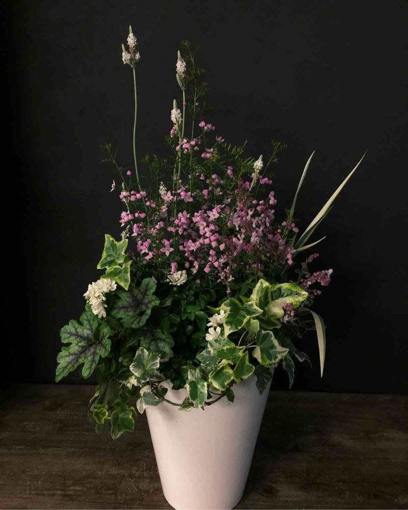 ボロニア、プレクトランサス、ディアネラ、アイビー、ヒューケラ、ミニバラ、ラベンダー