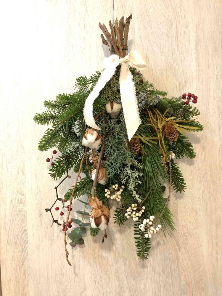 オレゴン産モミ、国産モミ、そして国産の若松を使って、クリスマスを過ぎてもお正月飾りとして飾れるように。リボンはシンプルなものを。