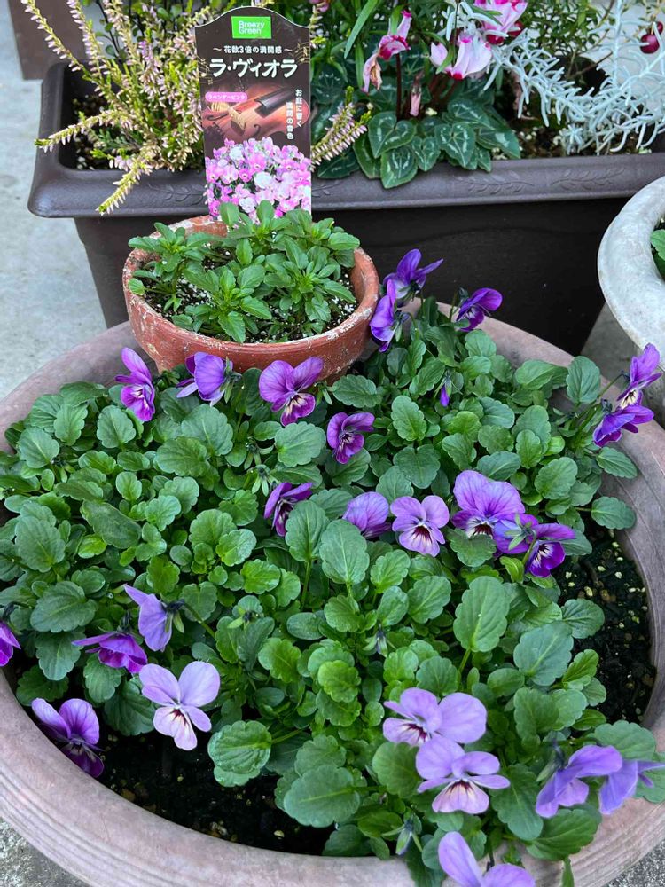 ラビィオラ ラベンダーピンクの3株寄せ植え 奥の小さい鉢が挿し芽をしたラビィオラ花芽は、確認できません^_^ 挿し芽した時と花の色がぜんぜん違ってきた?