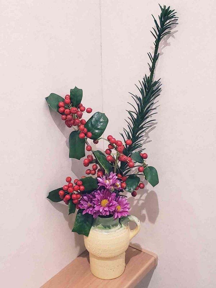 高野槙、実付き西洋ヒイラギ、菊の花を投げ入れ