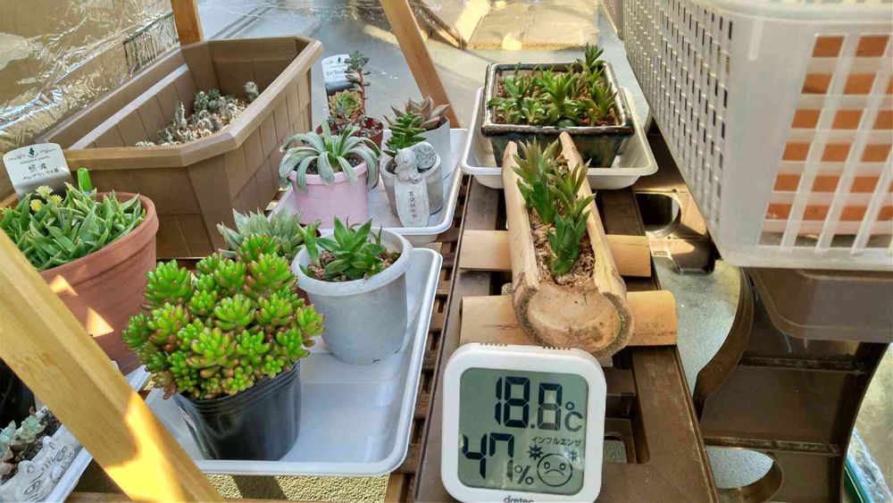 今の温室です。ハオルチアや、虹の玉を置きました。🥰
