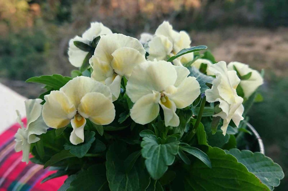 レモンイエローのような、アイボリーのような柔らかい色のビオラ🐘☺️