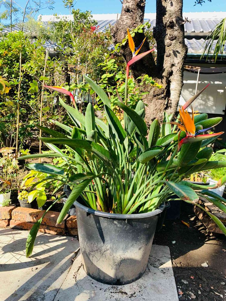 極楽鳥、綺麗に咲いたので正面に持ってきた。来年こそは地植えにしよう。