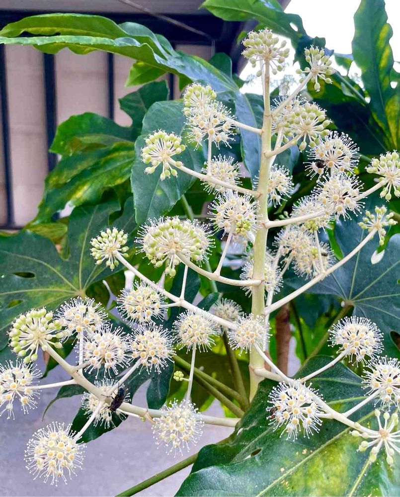 鹿児島では山で自生しているヤツデも時々見かけますが、急な斜面など、近づきにくい場所ばかりだったので、お花をじっくり見られるのはこのお庭が初めてかもしれません。