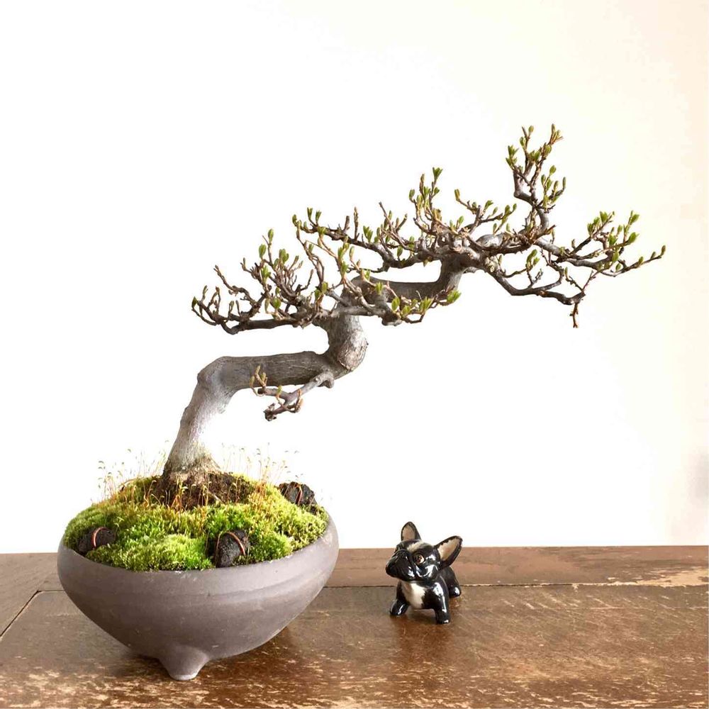 エゴノキの芽出しです。山採り後12年くらい経っています。樹高20cm。今年は花が咲くかなぁ?!枝先が内へ内へと伸びる変な性質があります。