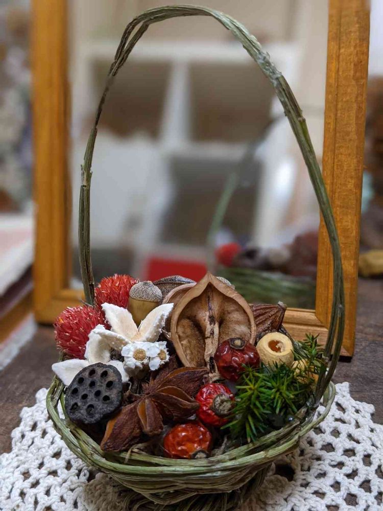 この子は花友が編んだ🧺にわたしがアレンジメントしたドライフラワーや木の実をinしたふたりの