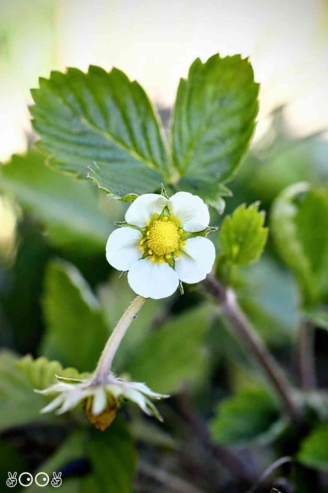 いちごの花🌼は、実の方に目が👀行くので覚えてない人がほとんどでしょうが、花弁がま~~るくてとても愛らしい姿をしていますネ。