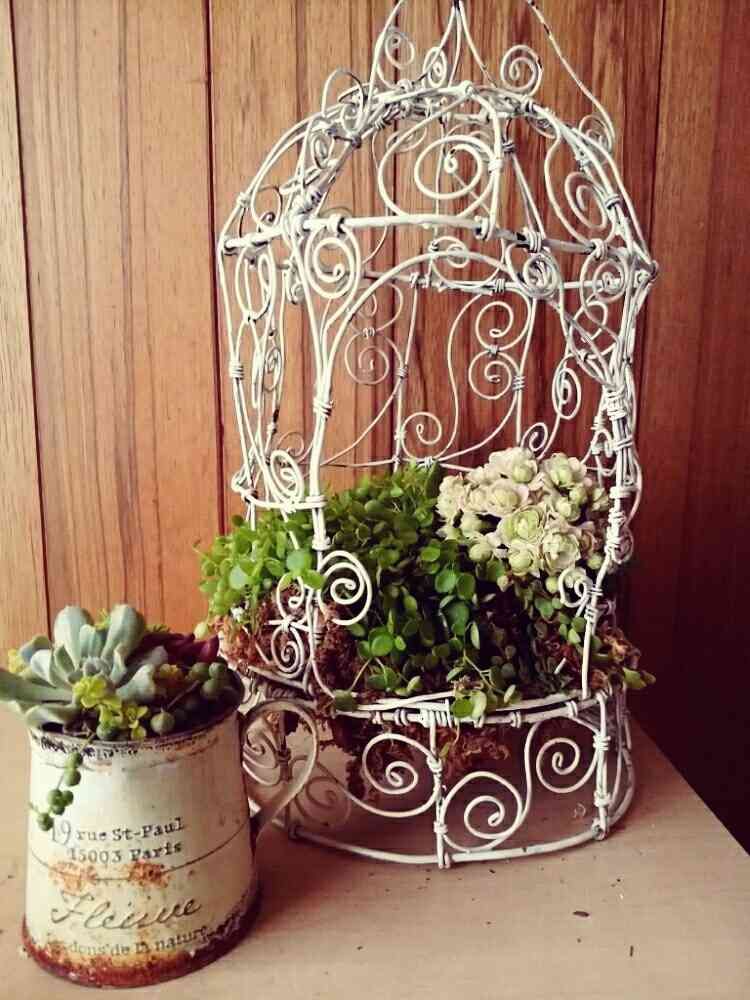 ワイヤーで鳥カゴ作って中に寄せ植えしてみたよ