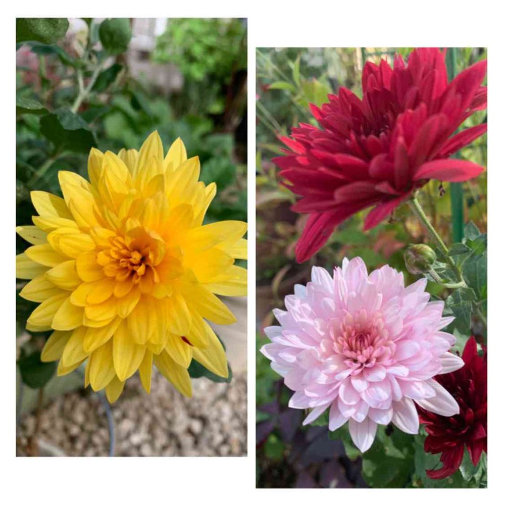 2年目からは右上の赤いダリアみたいなお花でした。なのに今年はピンクが2輪 黄色が1輪出てきたのです😮