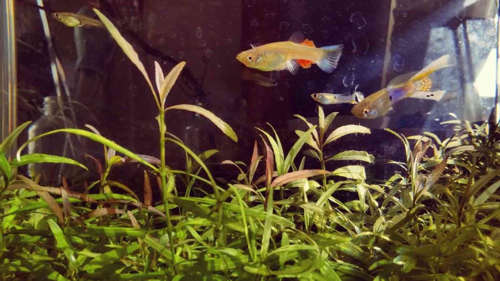 水草の名前分からないけど、グッピー可愛いですね。ソードテールとかいうのかな。