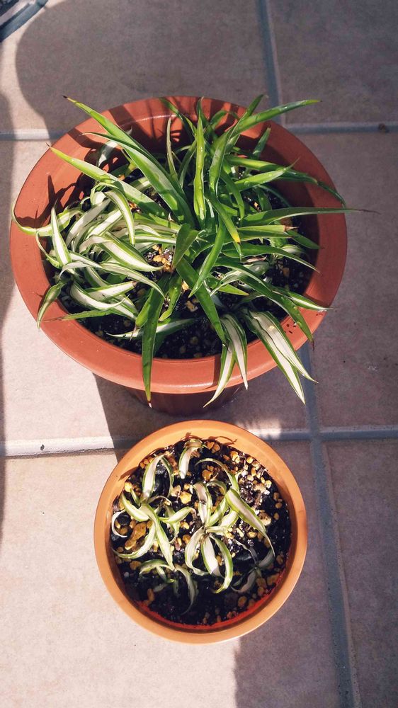水栽培していた、オリヅルランを 鉢に植え付けました。根はたっぷり出ていたから 育ってくれると思います?!(少し不安あり😅)