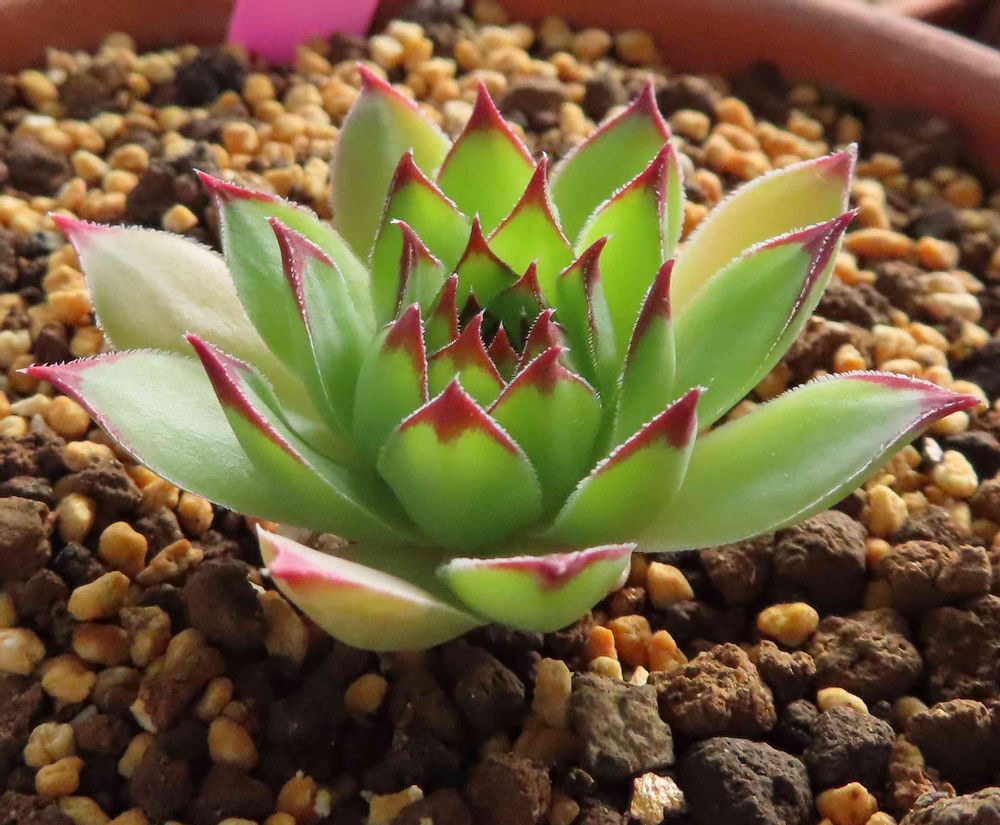 群生化していた上海ローズをばらばらにして,一番よさそうな株を独り立ちさせた。まだ株としては小さいけれど,赤の部分と緑の部分の割合が絶妙なのか,色合いがいいのか,美しさではにうちにいるセンペルの中ではかなりの上位に感じる。