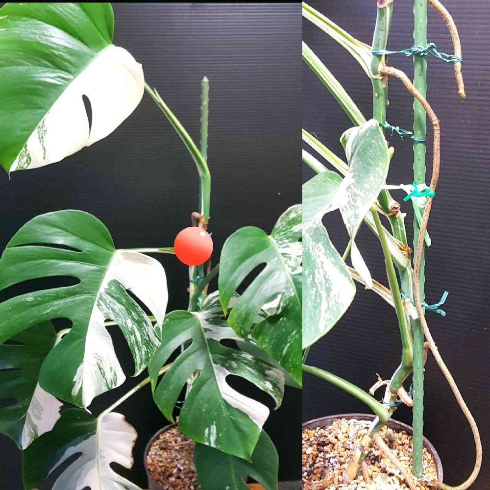このモンステラは🔴の所から気根が伸び鉢に入っています。おそらく根から一番目の葉と勘違いし初期葉の切れ込みの少ない葉が出たのかと思います。モンステラを育てて葉に切れ込みがなかなか入らない人は気根の状態を調べてみると良いかもしれません、多くの気根が伸びて全ての葉が初期の葉と誤認してるのかもしれません。