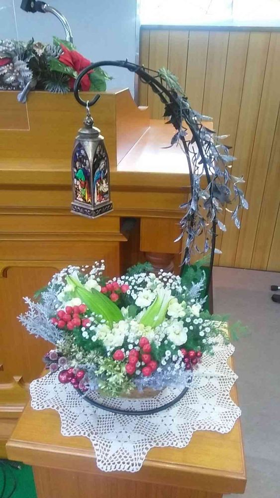 教会からもう1枚ーこれはアレンジの先生の作品です‼️あまりに素敵なので、投稿の許可を得て載せました‼️この後百合が開花し、雰囲気が変わりました‼️冬はお花が持つので、長く楽しめますよね💕
