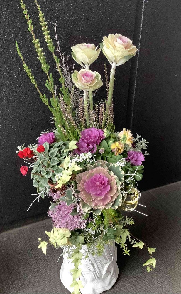 今回は先生がコーディネートした苗でお正月用の寄せ植えを作りました。