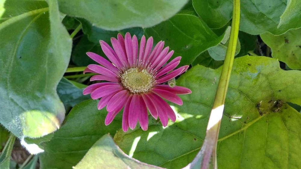 霜から逃れるように、大きな葉っぱに隠れてガーベラが一輪咲いてます🎶