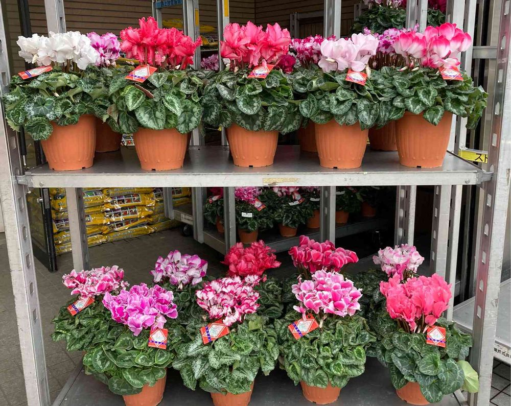 名古屋市内にある花屋さんの店内で数多くのシクラメンを見ましたが、搬入口にも大量のシクラメンが置かれていました。