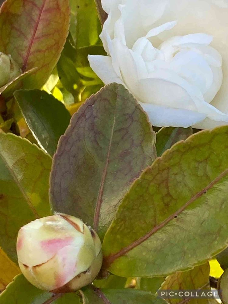 白い山茶花、蕾は白色かと思いきや、ピンクも混じってるようです💖