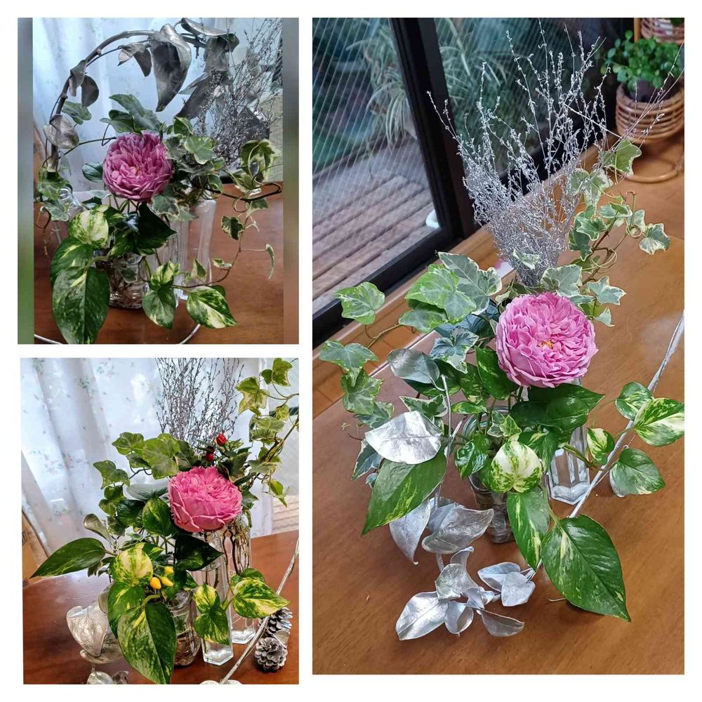 これは水差ししてるアイビーとポトスと薔薇とシルバーにカラーリングしたコキアの瓶4本くっつけてるの😁