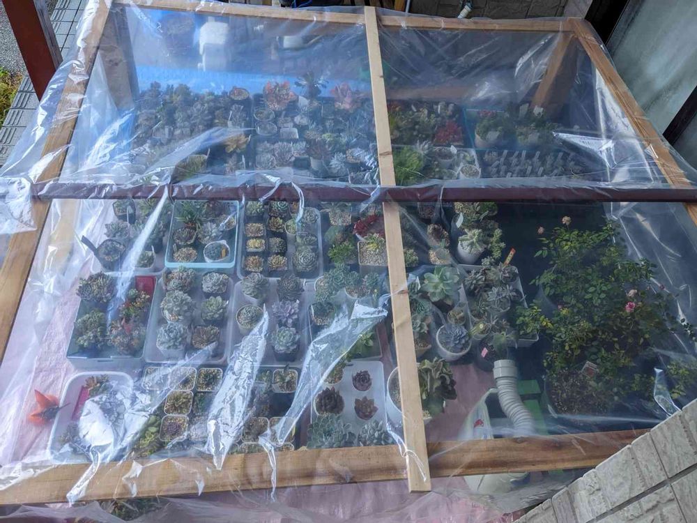 今朝は、冷え込みました。−2〜3度ぐらいになりました。日中も6度ぐらいの予想です。多肉達をテラスに入れていますが、流石にマイナスなのでハウスの様にしていますが、温度が上がるわけではないので、右下に少し写っている布団乾燥機で温めて見ました。変わるかな~🤣