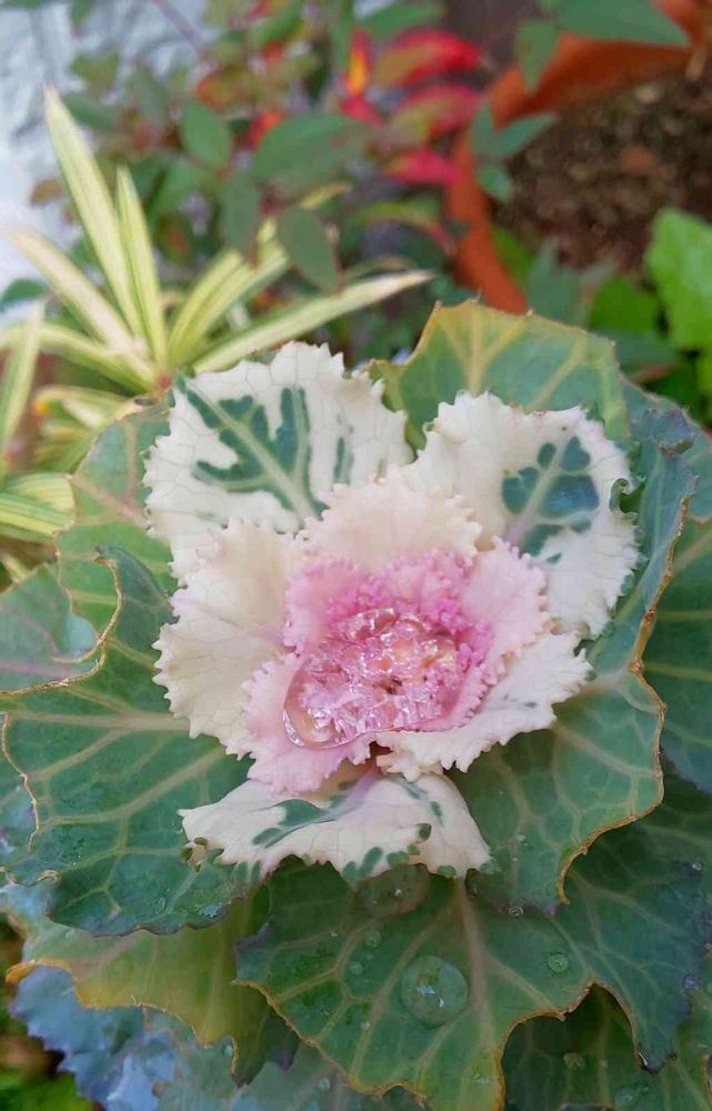 雨が土砂降りになり、サーッと上がったあと葉牡丹の真ん中にフルフルの大きな水滴が。😄💧