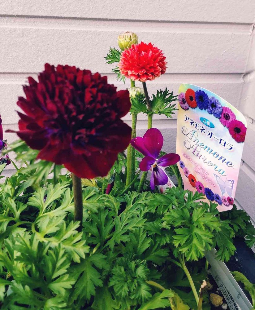 アネモネと、一緒にいる子は、♫あかね色のメイ〜で、えんじ色です〜鉢が小さいから、これで精一杯の寄植えです〜花が少ない時期に貴重な映えるお花ですよね🤩