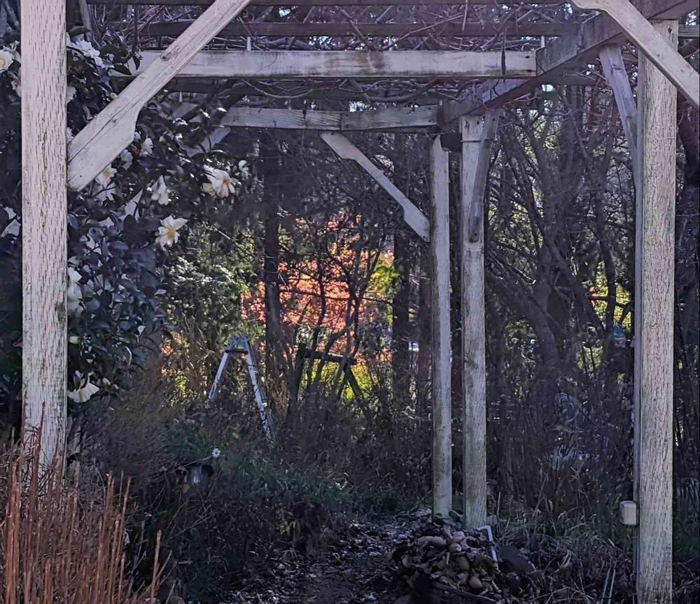 寒風吹き荒ぶ庭のパーゴラの向こう、お隣のヒノキ林の山香ばしがオレンジ色に輝いています。