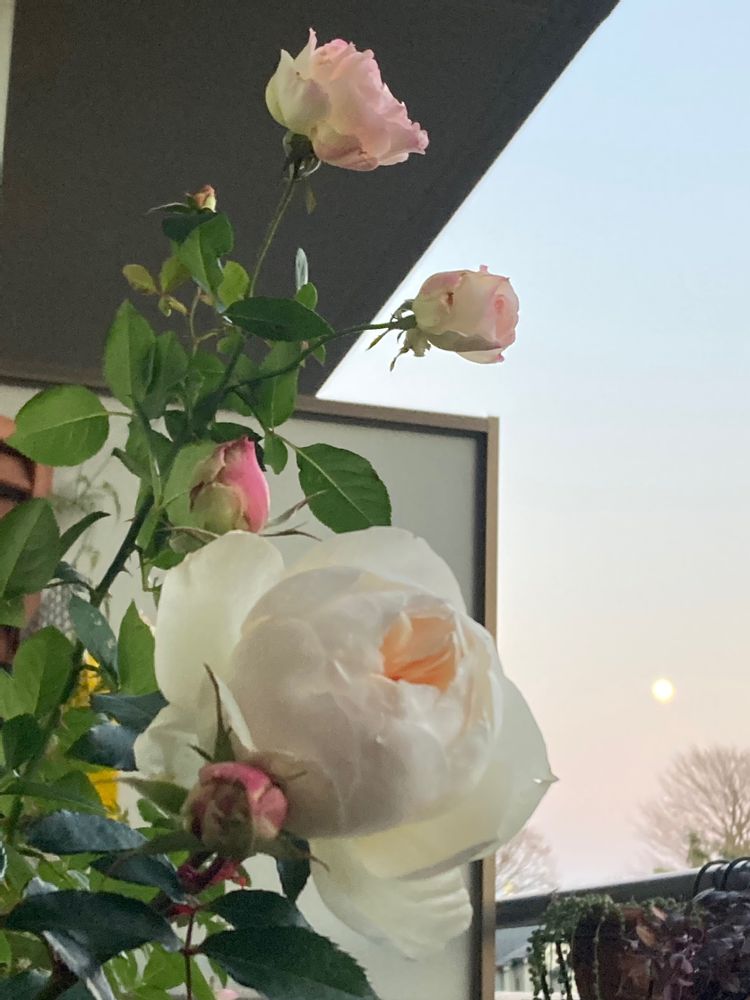 ステファニーグッテンベルクが少しづつ咲いて今丸くなってお月様のようだなぁと思って空を見るとそこに丸いお月様が✨