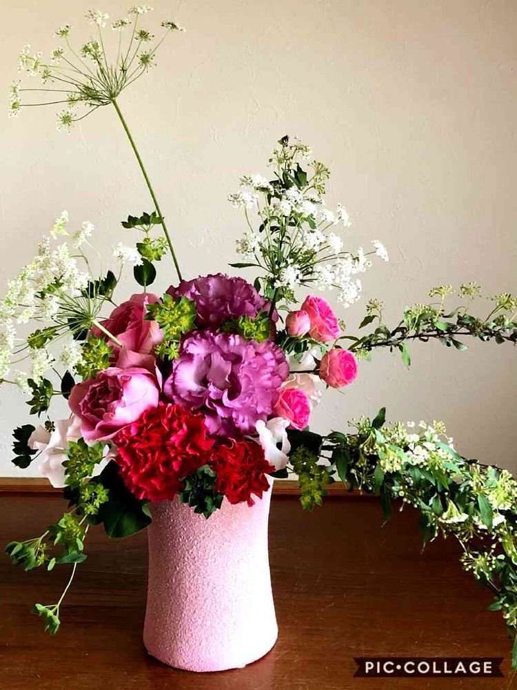 メインは、何だろう?真ん中のトルコキキョウの色が"(*'v^*)ステキ♪"で、花瓶から飛び出したレースフラワーやコデマリもイイネ。全部いいから選べない😱💦コデマリあるんですね。咲いたら見てみたいです🤗💕