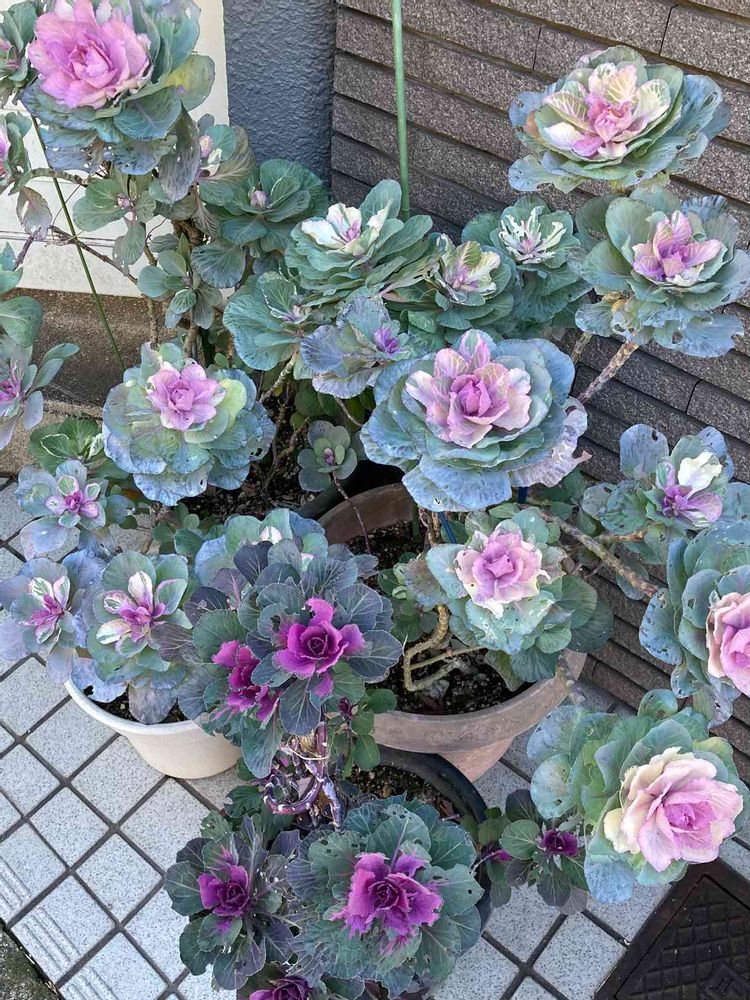 踊り葉牡丹の鉢植えが4っ揃うととても豪華に見えます。ここのおうちの奥さまはとても上手に育てておられます。