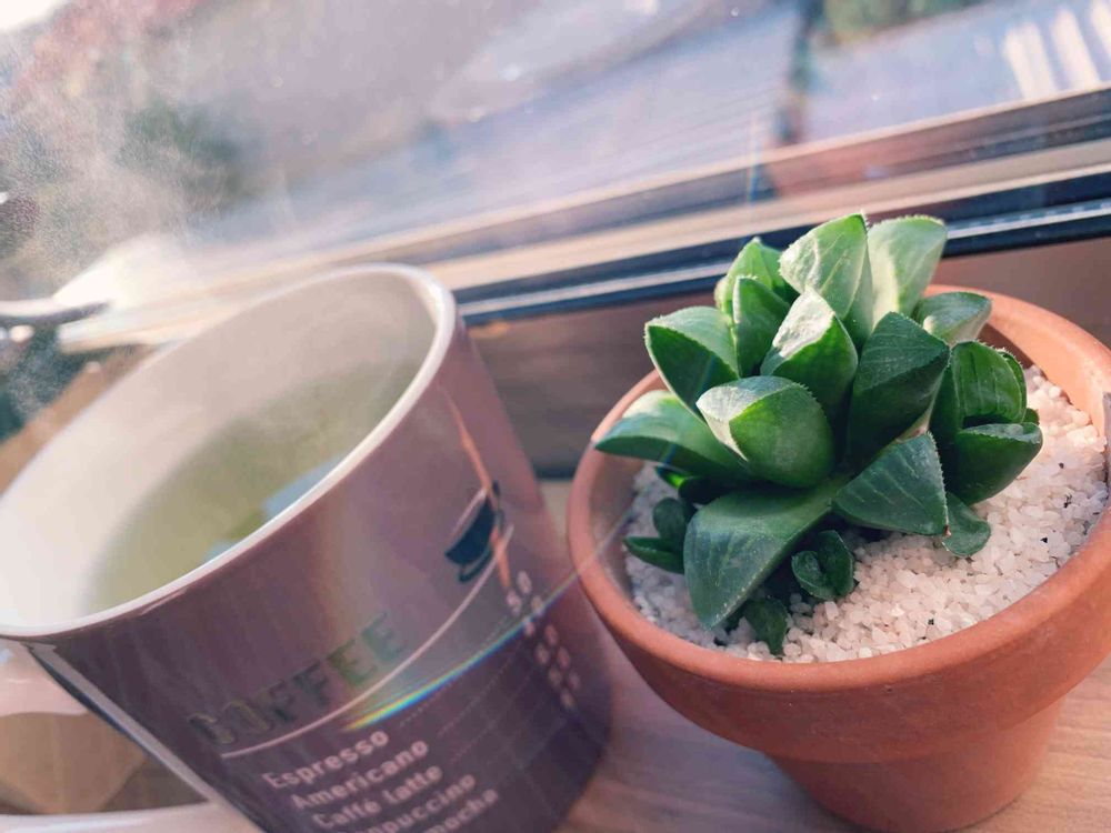 ハオルチア: 今は2度、普段は日陰にいるもんだから温かいお茶であったまるとしますか〜🍵