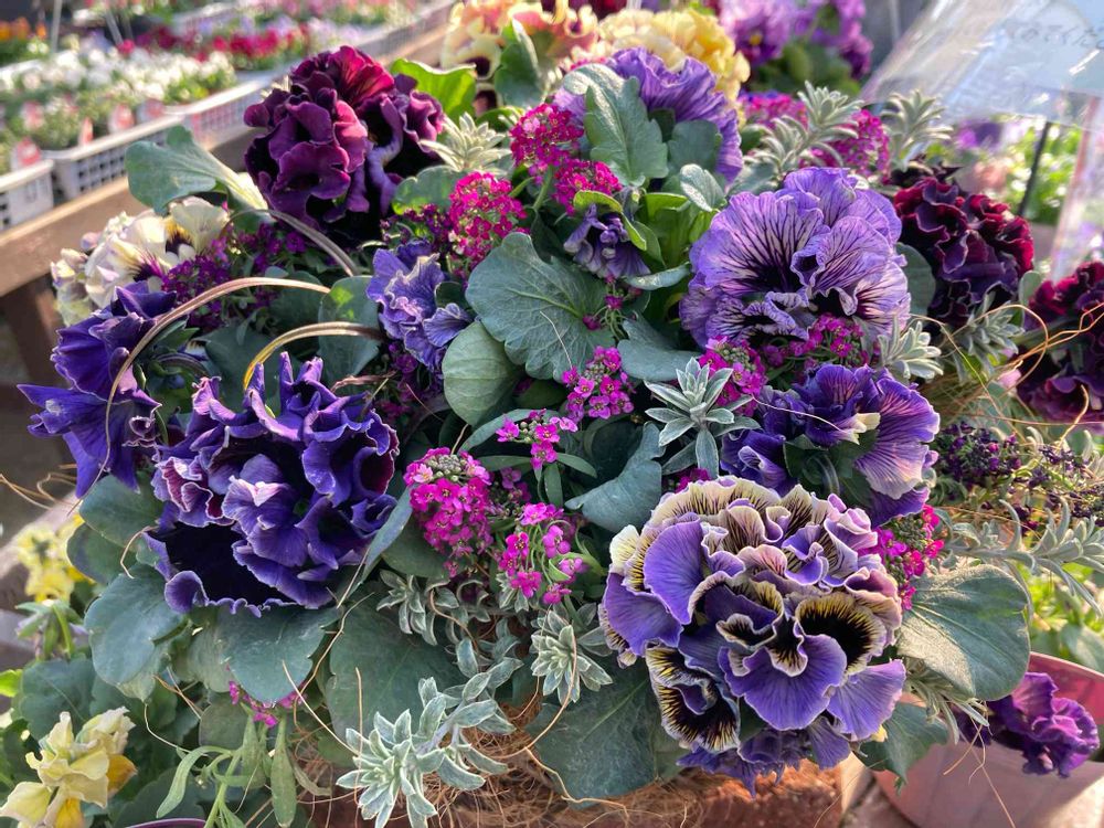4号鉢にビオラ3株とアリッサム2株と葉っぱを1株と言われたけど、お財布相談&初めてなのでそこまで入れられる?🤔とビオラは1株にしました
