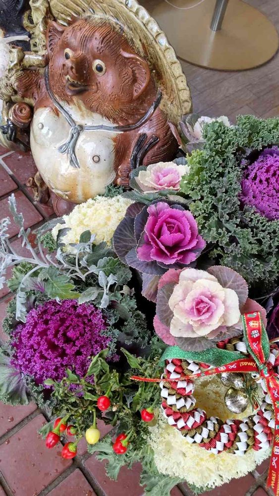 商売繁盛の縁起物 信楽焼のタヌキと葉ぼたんの寄せ植え