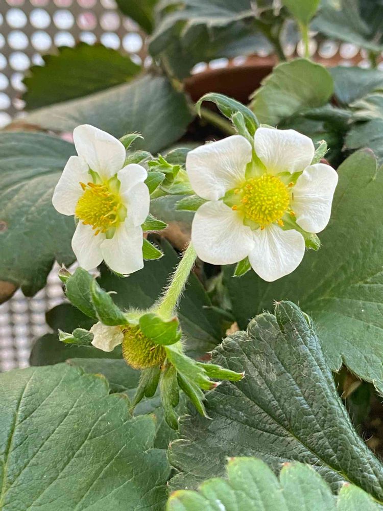 最近、寒いのにイチゴ🍓の花が次々咲いています💕