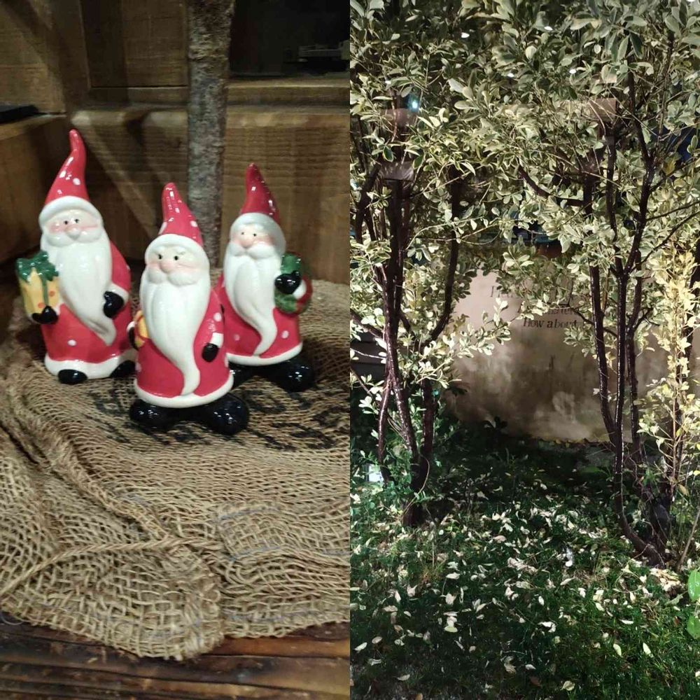 お気に入りのカフェの敷地内の木々とサンタさんのフィギュアです。やっぱりこのサンタさん可愛い〜👍💕 サンタさんは売りものではなくてディスプレイとして飾ってありました🤗💕