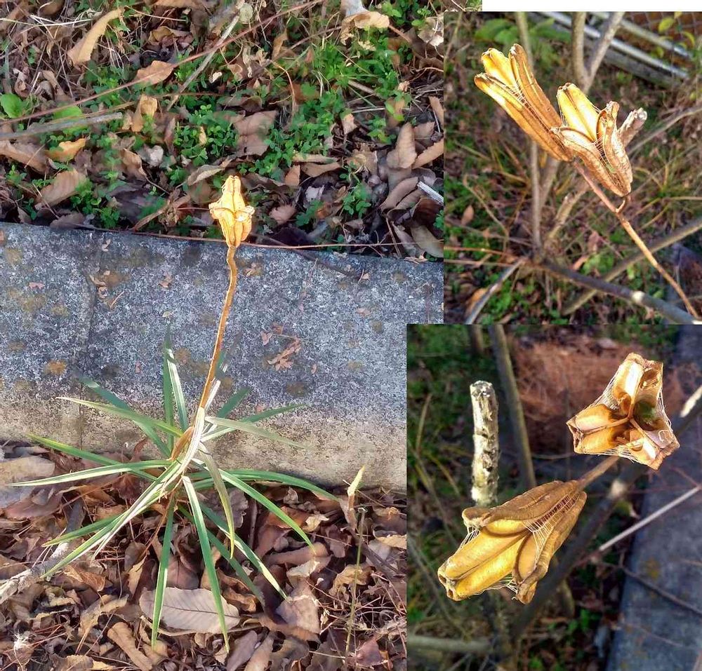 雑草花壇にて、シンテッポウユリの実を観察。