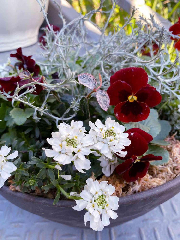 (イベリス、ハツユキカズラ、プラティーナ)に赤いビオラを合わせてみました🤗