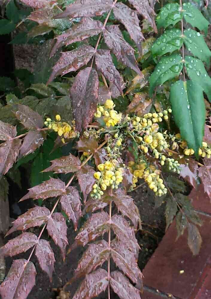 実家の玄関脇に植えられたヒイラギナンテンのお花がちょうど咲いてます。