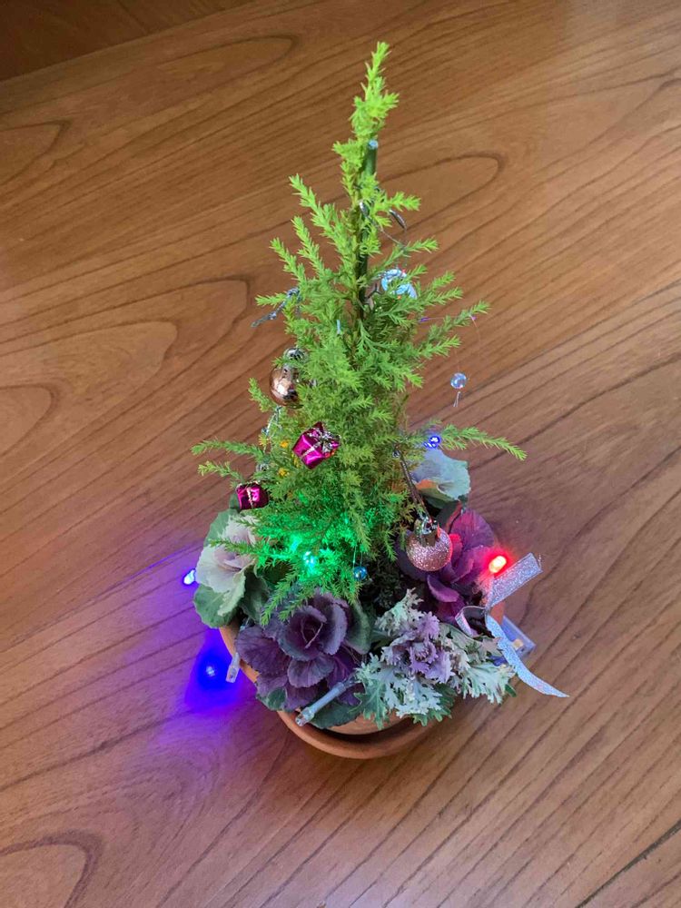 我が家のテーブルツリーです。イルミネーションも付けてみました〜(^^♪。