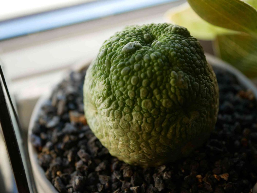 形がミカンのようでもあり、肌がゴーヤのようでもあり、何とも不思議な存在感のある多肉さんですね🌵