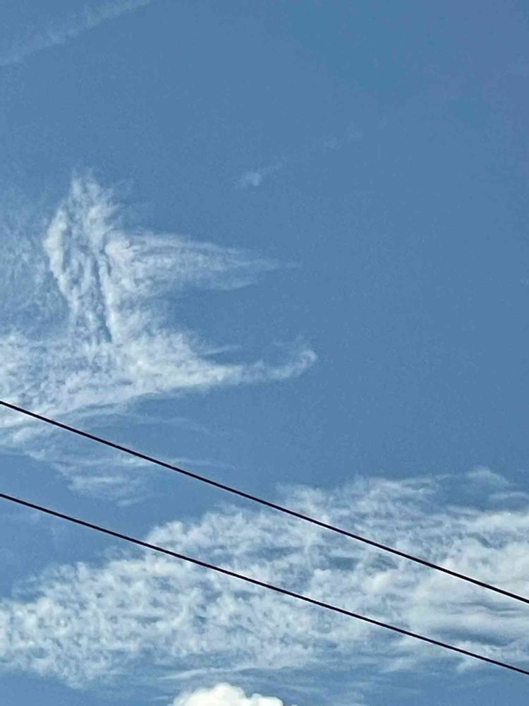 左上に後光がさしている菩薩さまのお姿のような雲と、電線の間にも何方かのお顔のような雲がありました😃