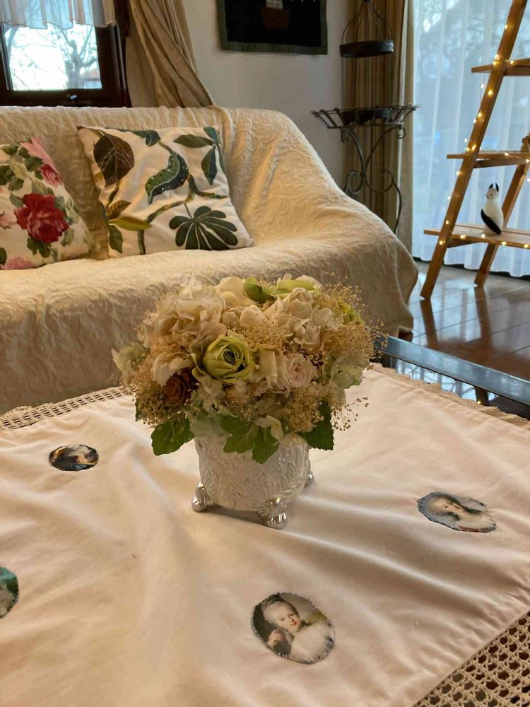友人がアップルパイを焼いたとお茶に誘ってくれました❣️パイも感激の味でしたが、クッションも、テーブルセンターも、花のアレンジも、なんと後ろに映った台も手製だそうです‼️えっ🤯台が見えない‼️と言う声が聞こえて来たので⁉️2枚目に続く・・