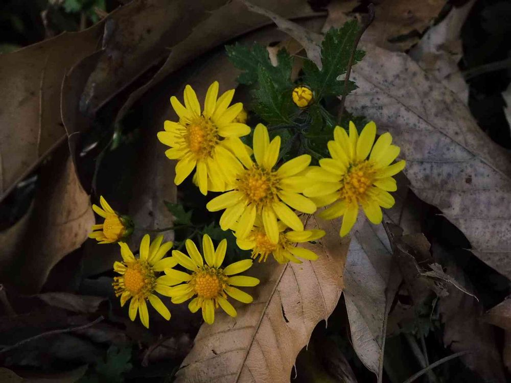 帰り際に見つけた枯葉の間の菊