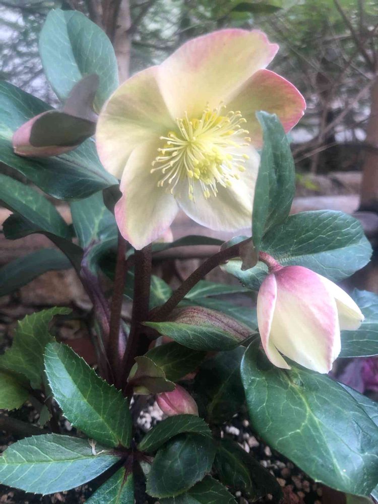 先日開花したクリスマスローズの花色が、薄くグリーンがかってきました。縁には薄いピンクも入って可憐な姿を見せてくれています🥰